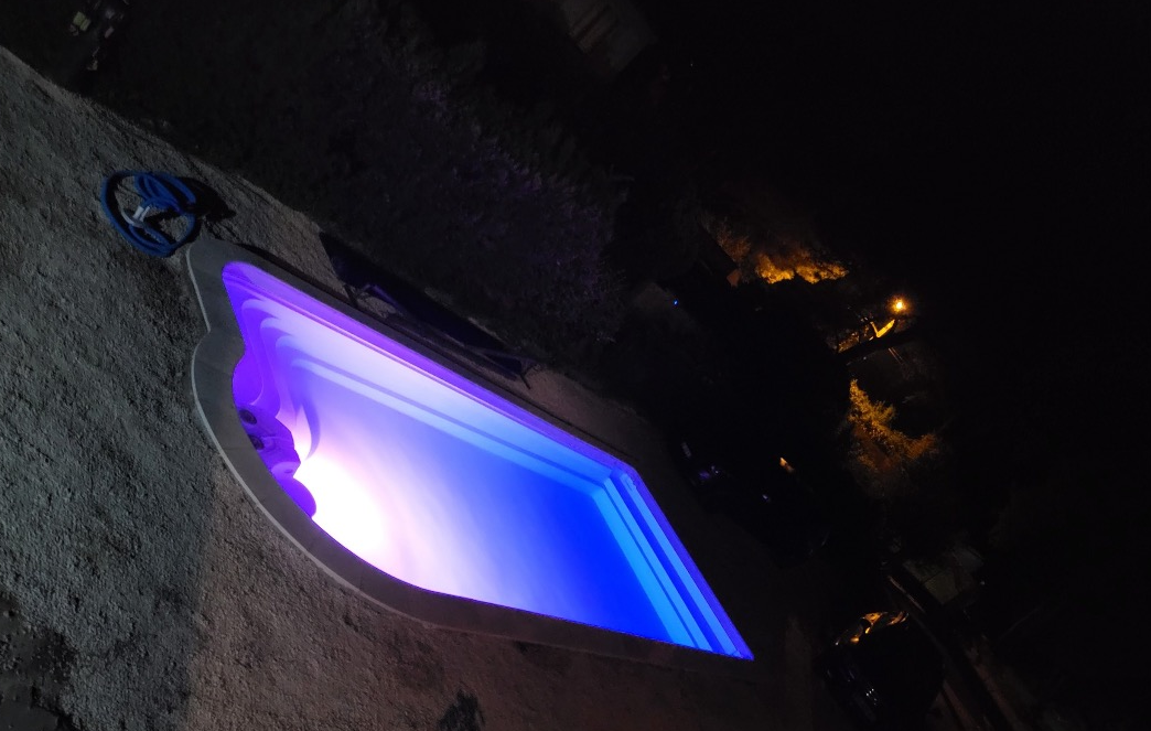 Pour sublimer l’ensemble, le client a opté pour un projecteur LED multicolore, créant une ambiance lumineuse unique lors des baignades nocturnes. Les jeux de lumière offrent un rendu visuel spectaculaire et personnalisable selon les envies.